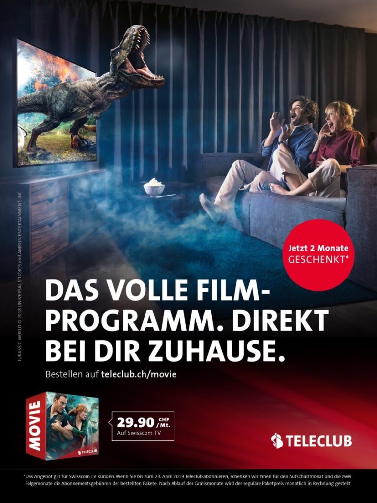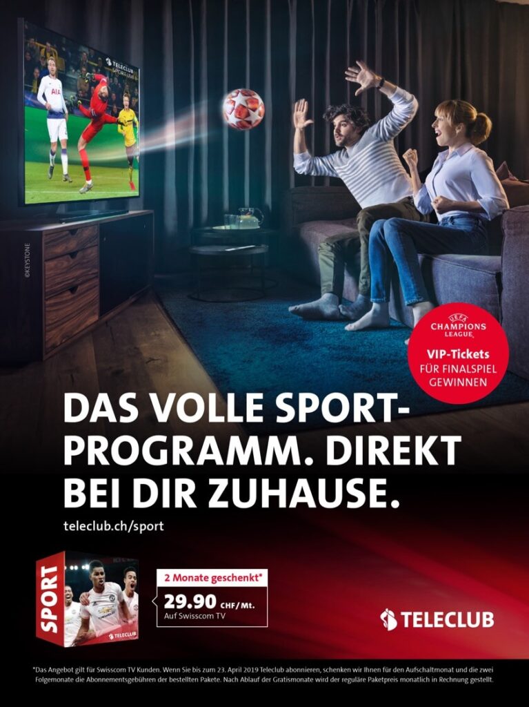 Anzeigen inszenieren gekonnt und mit einem Augenzwinkern die mitreissenden Erlebnisse, die man sich als Teleclub Kunde direkt nach Hause holt.